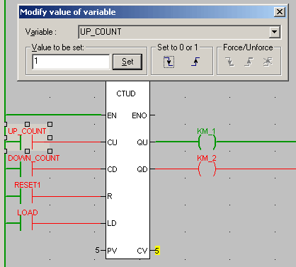Запустив программу можно заметить, что катушка КМ_2 сработала. Катушка КМ_2 относится к декрементному счетчику; напротив КМ_1 сработает в том случае, если инкрементный счетчик начнет свой отчет в повышающую сторону накопительному входу.